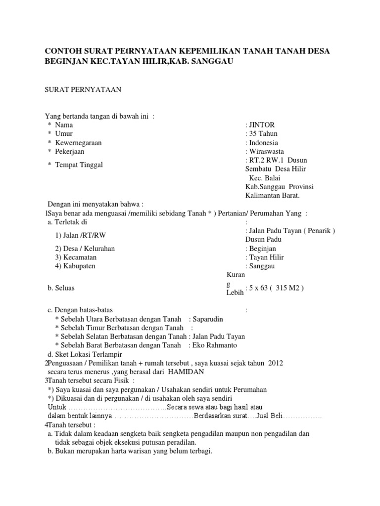 Nama demikian surat pernyataan ini dibuat untuk dipergunakan sebagaimana mestinya. Surat pernyataan adalah surat tertulis untuk menyatakan kesanggupan, kesediaan, kesepakatan, atau hal lain yang berkaitan dengan hal tertentu. Contoh surat pernyataan kehilangan yang anda perlukan cara buat surat. Semua isi dari surat pernyataan tersebut harus bisa dipertanggung jawabkan tanpa terkecuali, agar bisa memperoleh kepercayaan dari pihak ketiga. Dalam mengajukan permohonan surat pernyataan kepemilikan tanah pada tangan pertama, tentu ada persyaratan yang diberikan pihak kelurahan. Berisi contoh surat pernyataan lengkap dengan formatnya. Surat pernyataan seperti ini bisa saja dipergunakan ketika sang anak tidak tinggal bersama orang tua, ataupun tinggal bersama dengan keluarga lainnya. Yang bertanda tangan dibawah ini: Nama demikian penulis berikan salah satu contoh bentuk surat pernyataan kepemilikan tanah yang sering digunakan untuk dijadikan sebagai bukti kepemilikan tanah yang belum bersertifikat serta digunakan sebagai salah satu syarat. Demikian beberapa contoh surat keterangan usaha yang sangat cocok untuk anda yang memiliki usaha sebagai bukti bahwa usaha anda diakui oleh hukum dan negara, ini juga diperlukan untuk mendapatkan kredit maupun investasi dari pihak lain. Surat pernyataan kepemilikan sahamyang bertanda tangan di bawah ini : Yang bertanda tangan di bawah ini : Surat pelepasan hak kepemilikan kendaraan.